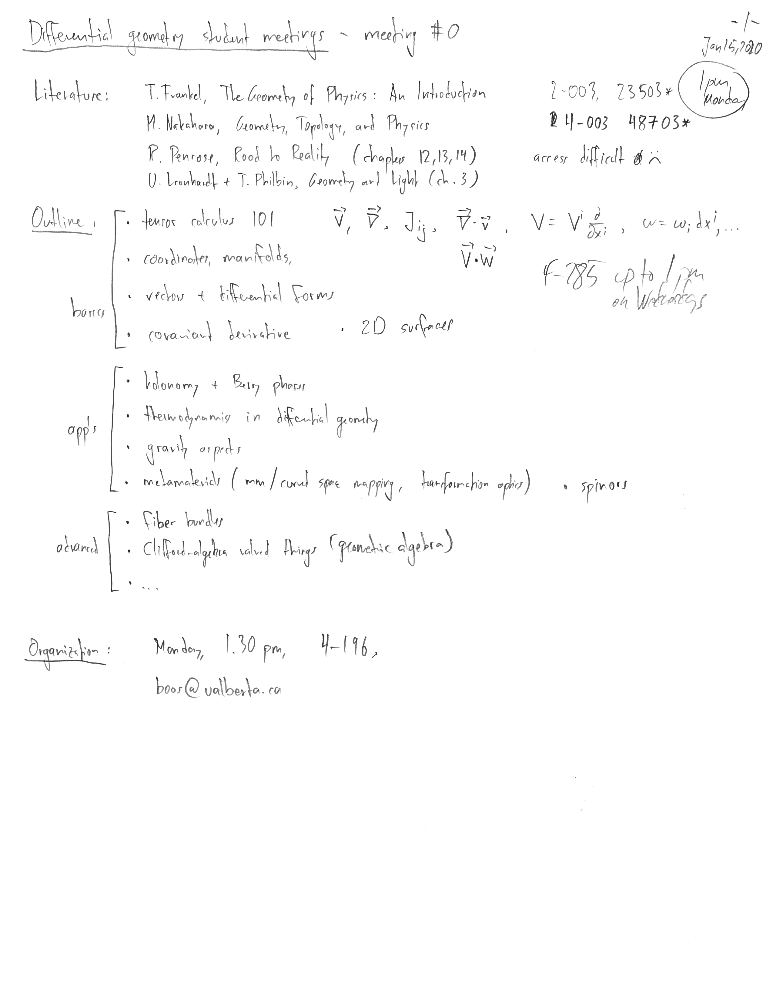 | what | Students with some prior exposure to special relativity and general relativity meet once a week to systematically discuss topics in differential geometry. Additional topics that can be discussed can be found further below under Suggestions for further meetings. Input welcome! |