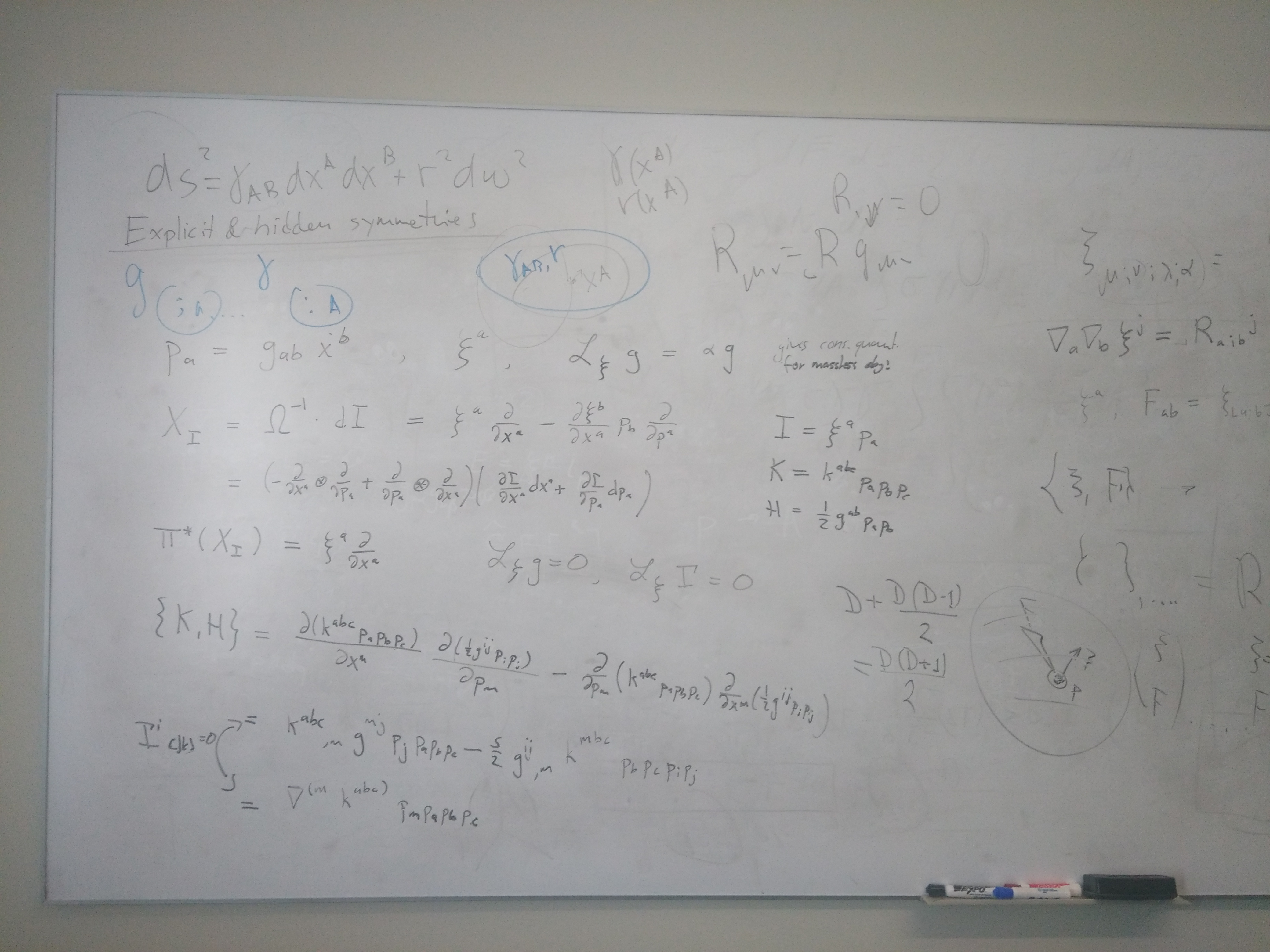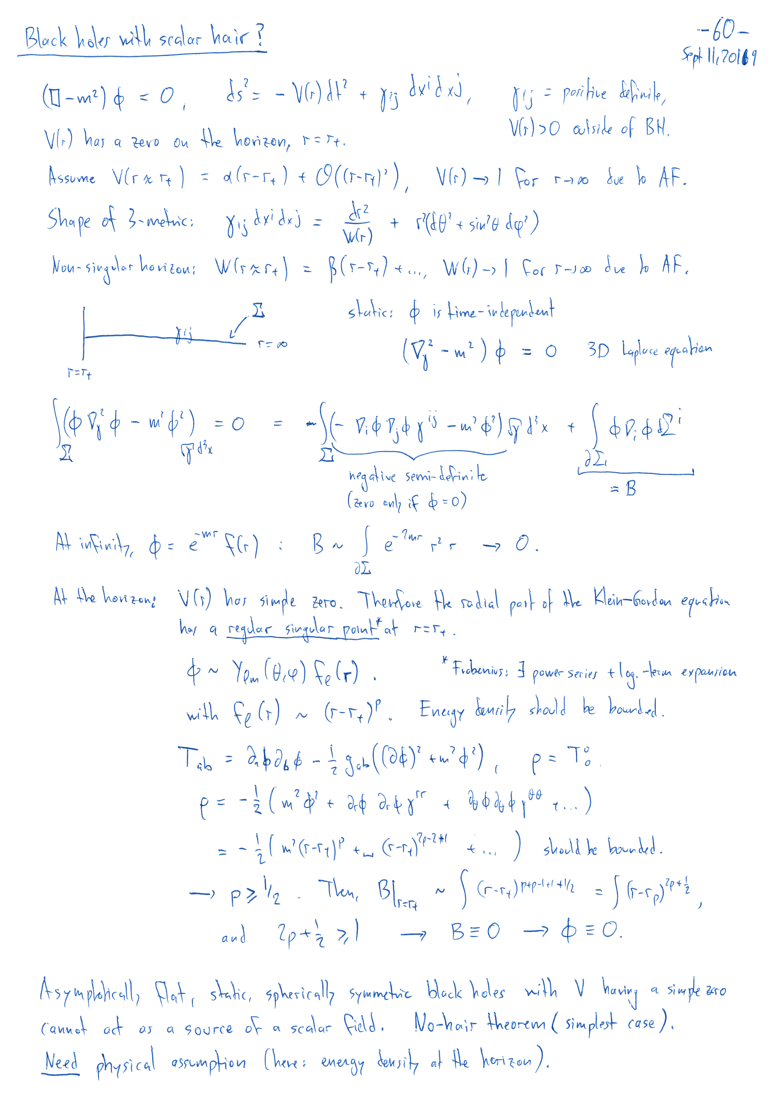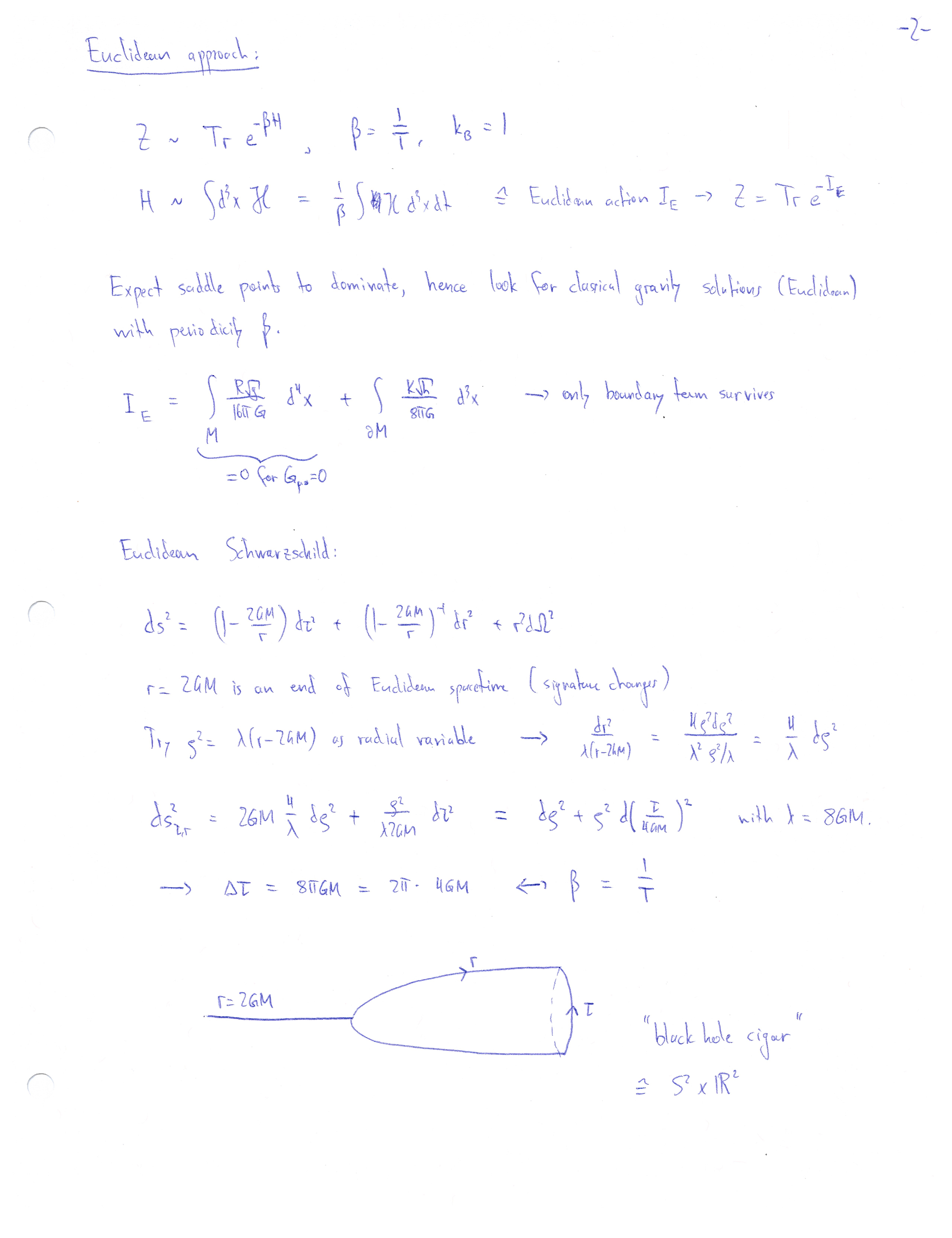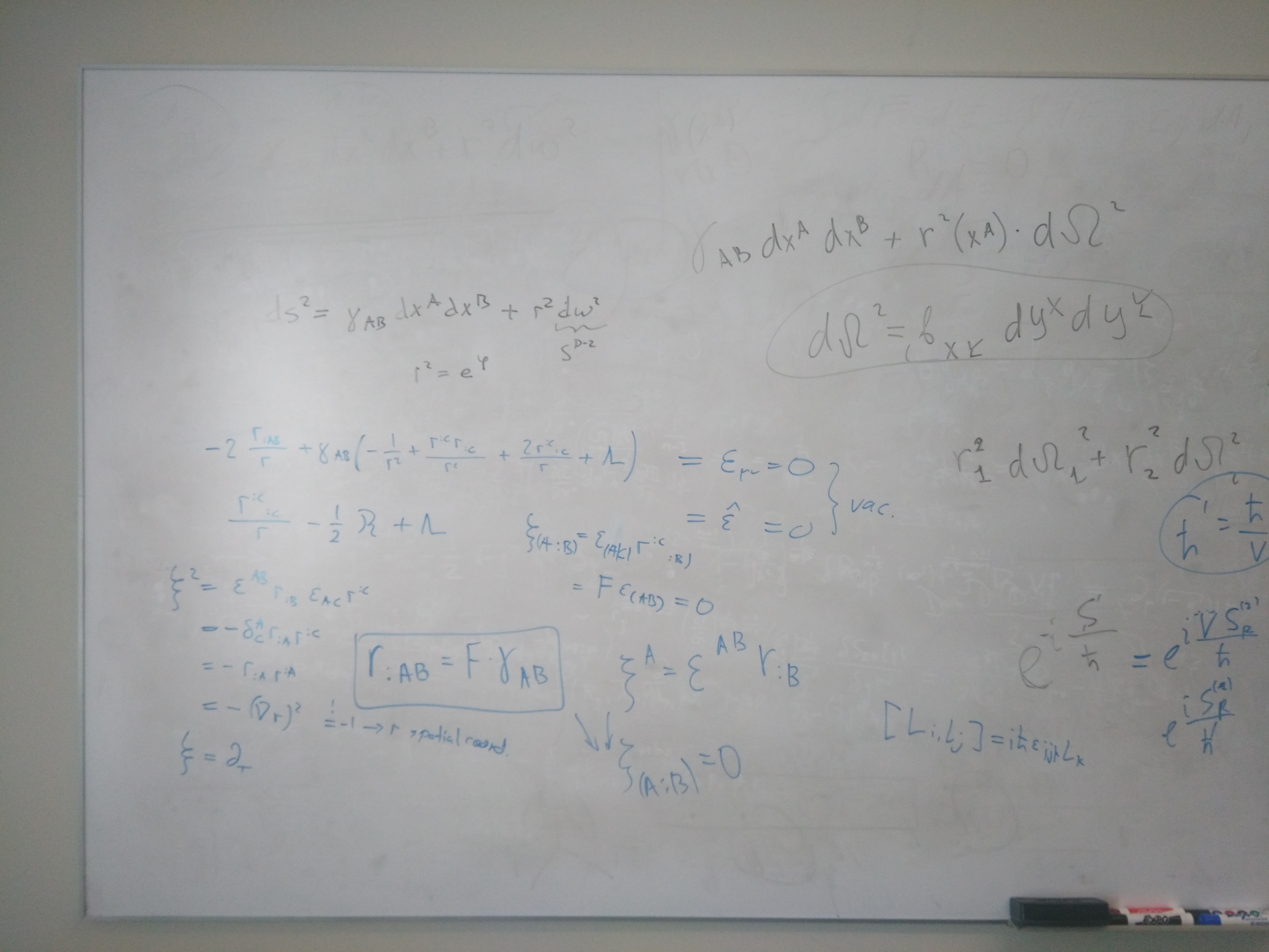 - 2019-09-12: black hole thermodynamics (cont'd), Hawking temperature, surface gravity, black hole information loss paradox, Gauß–Codazzi review, Euclidean trick, Euclidean action, Brown–York stress tensor, asymptotic charges, supertranslations, superrotations, entropy from soft charges