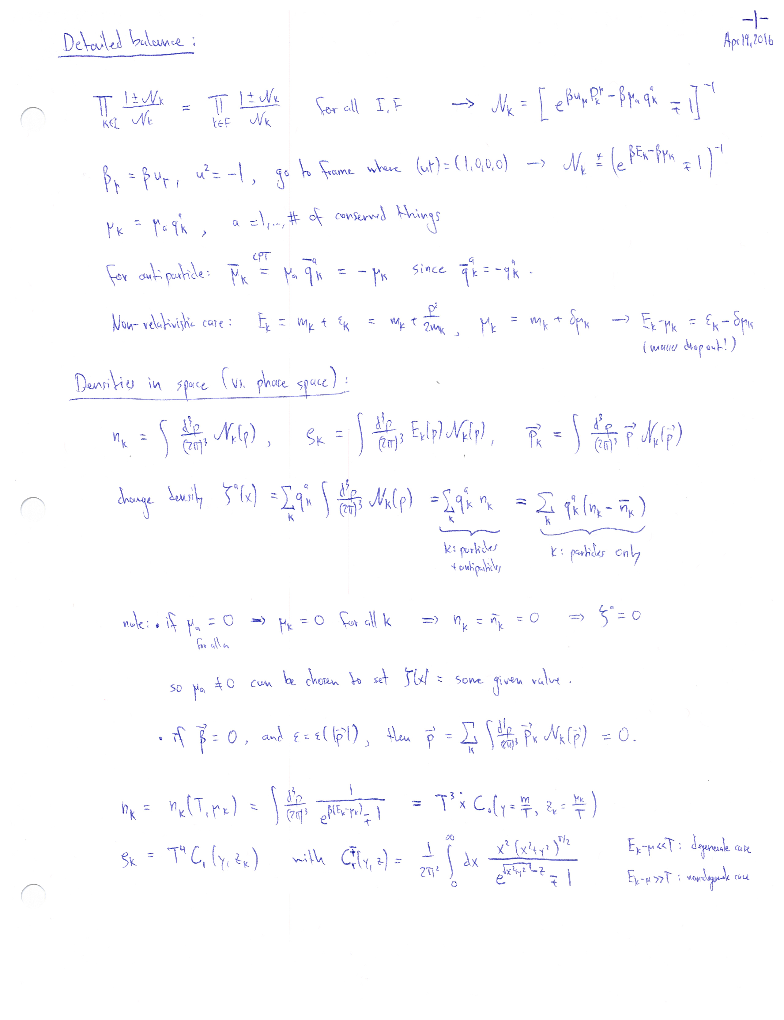 - 2016-04-19: equilibrium conditions (cont'd), densities in real space and phase space, Boltzmann equation in an FLRW universe
