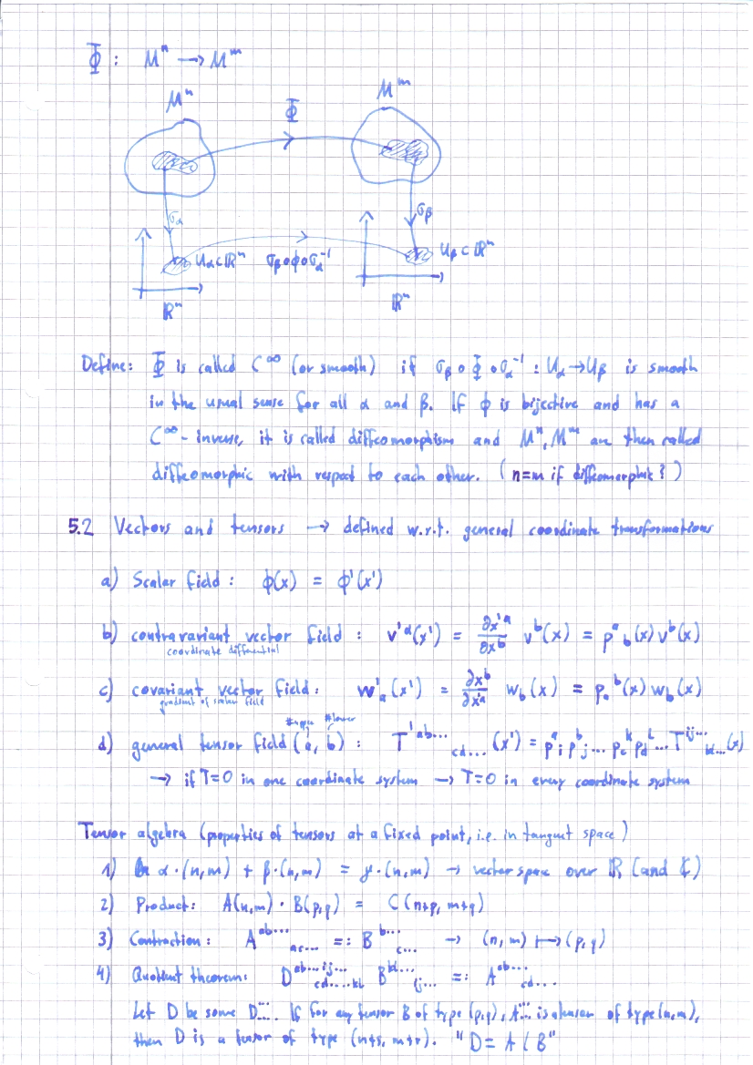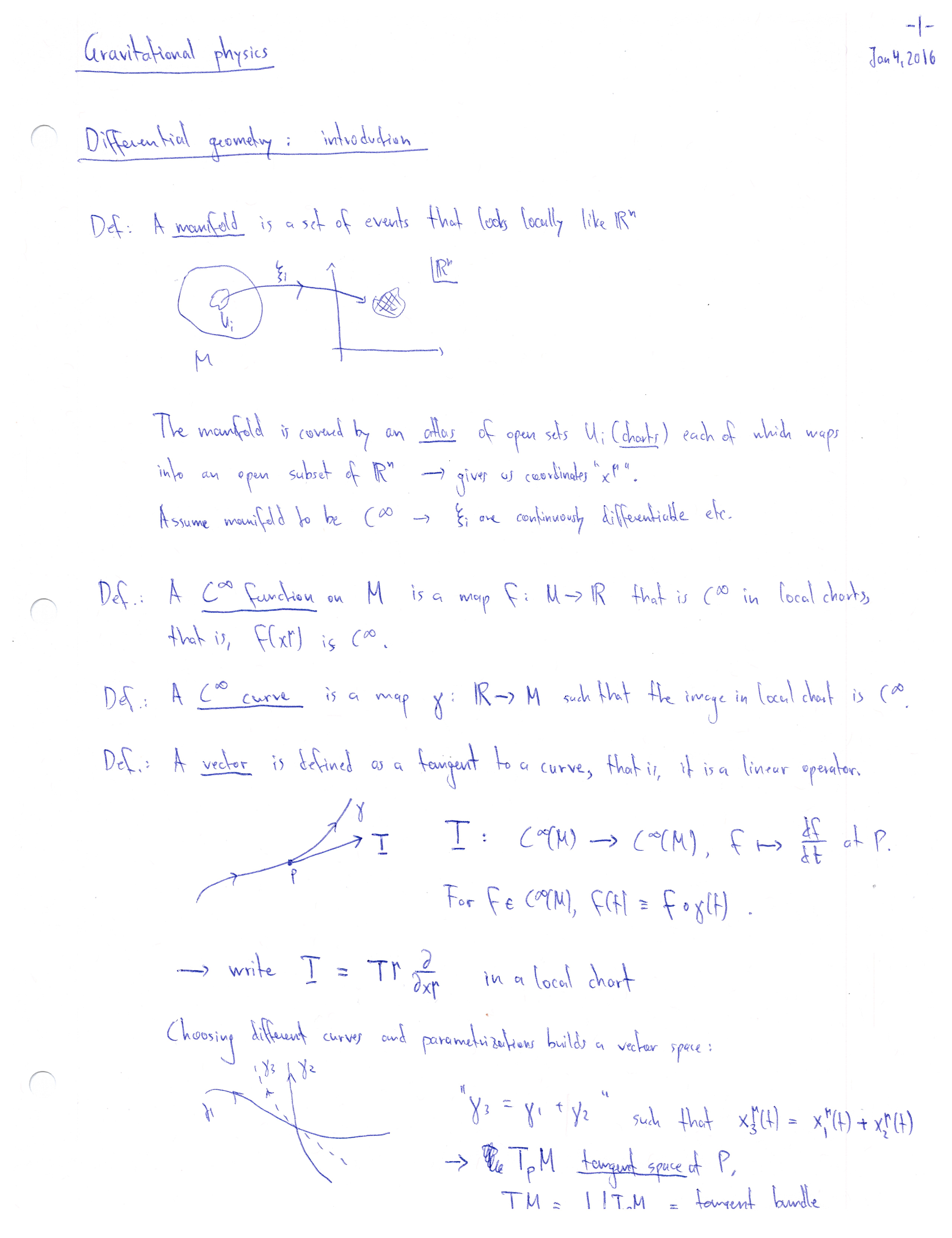 - 2013-01-16: differential geometry in modern formulation, tangent space, tangent vectors, differentials and cotangent space, tensor algebra and metric, exterior algebra