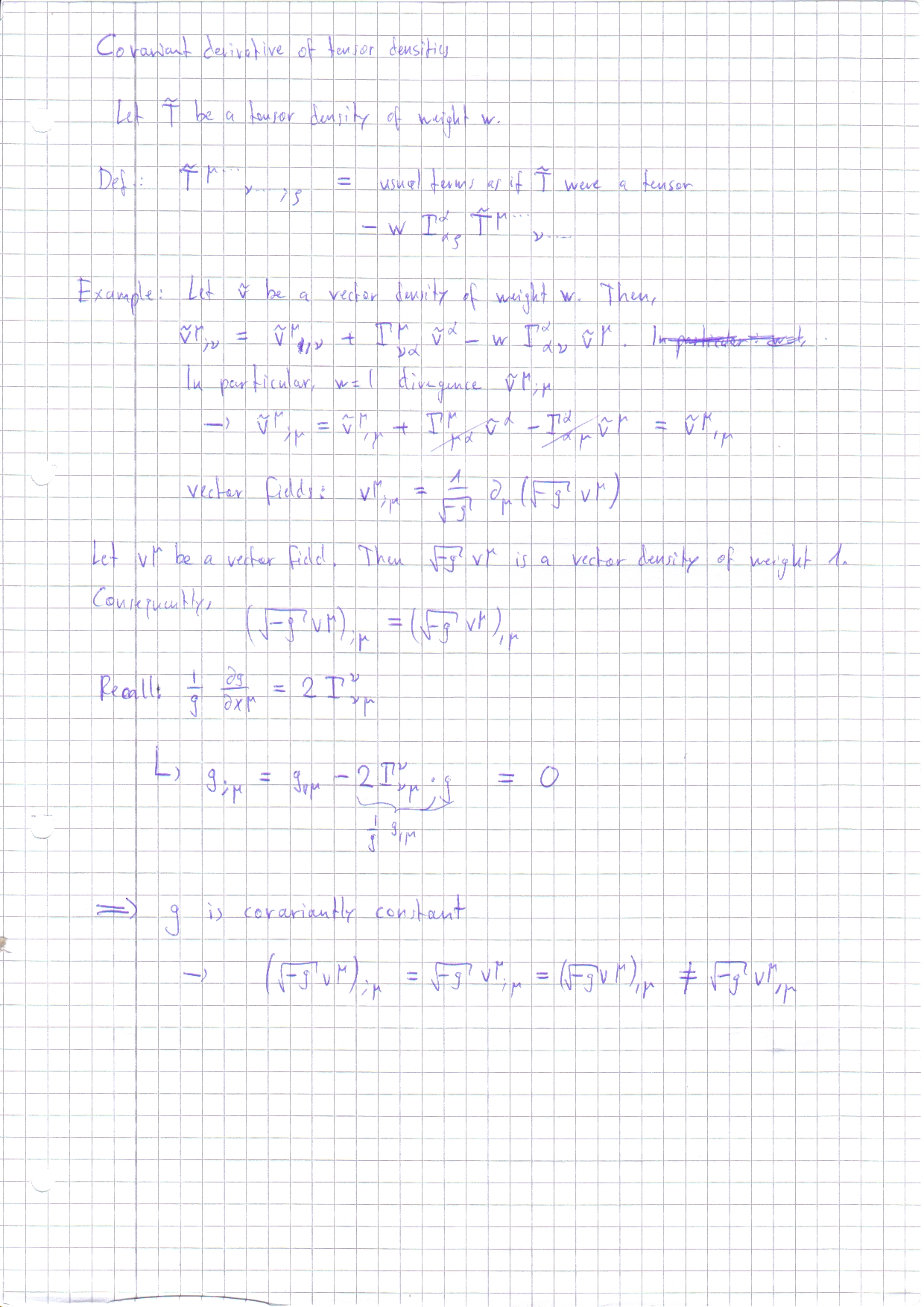 - 2012-11-12: tensor analysis, covariant derivative, absolute differentiation along a curve, covariant derivative of tensor densities