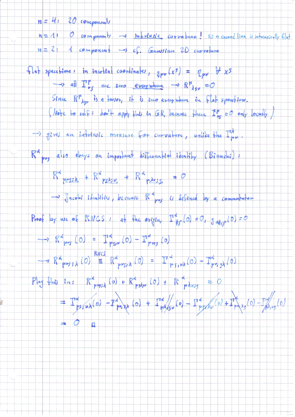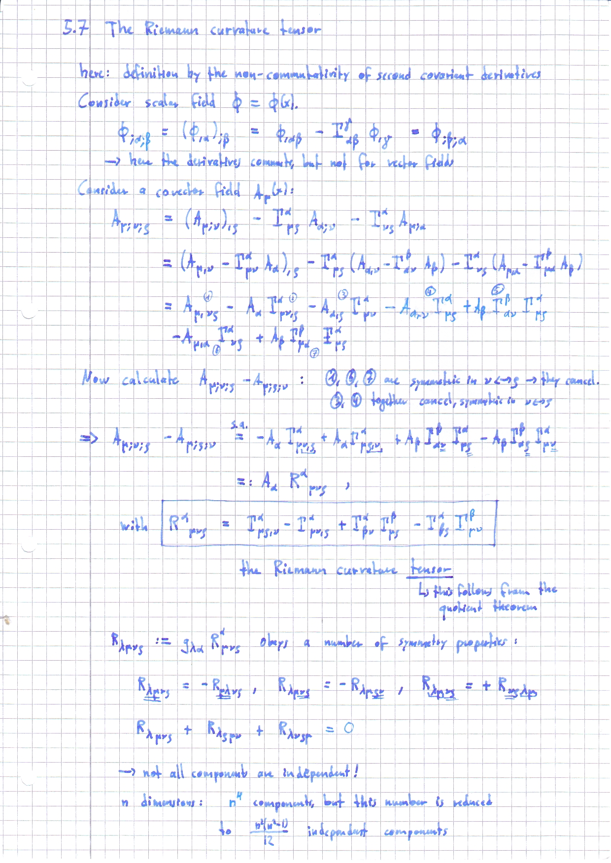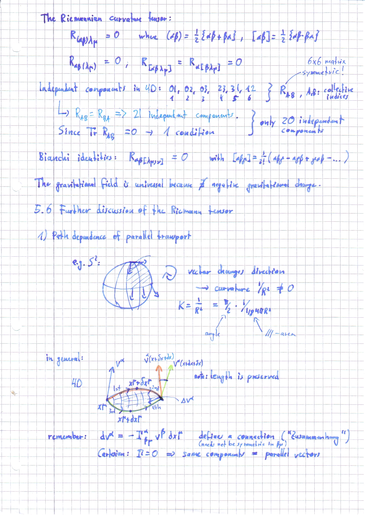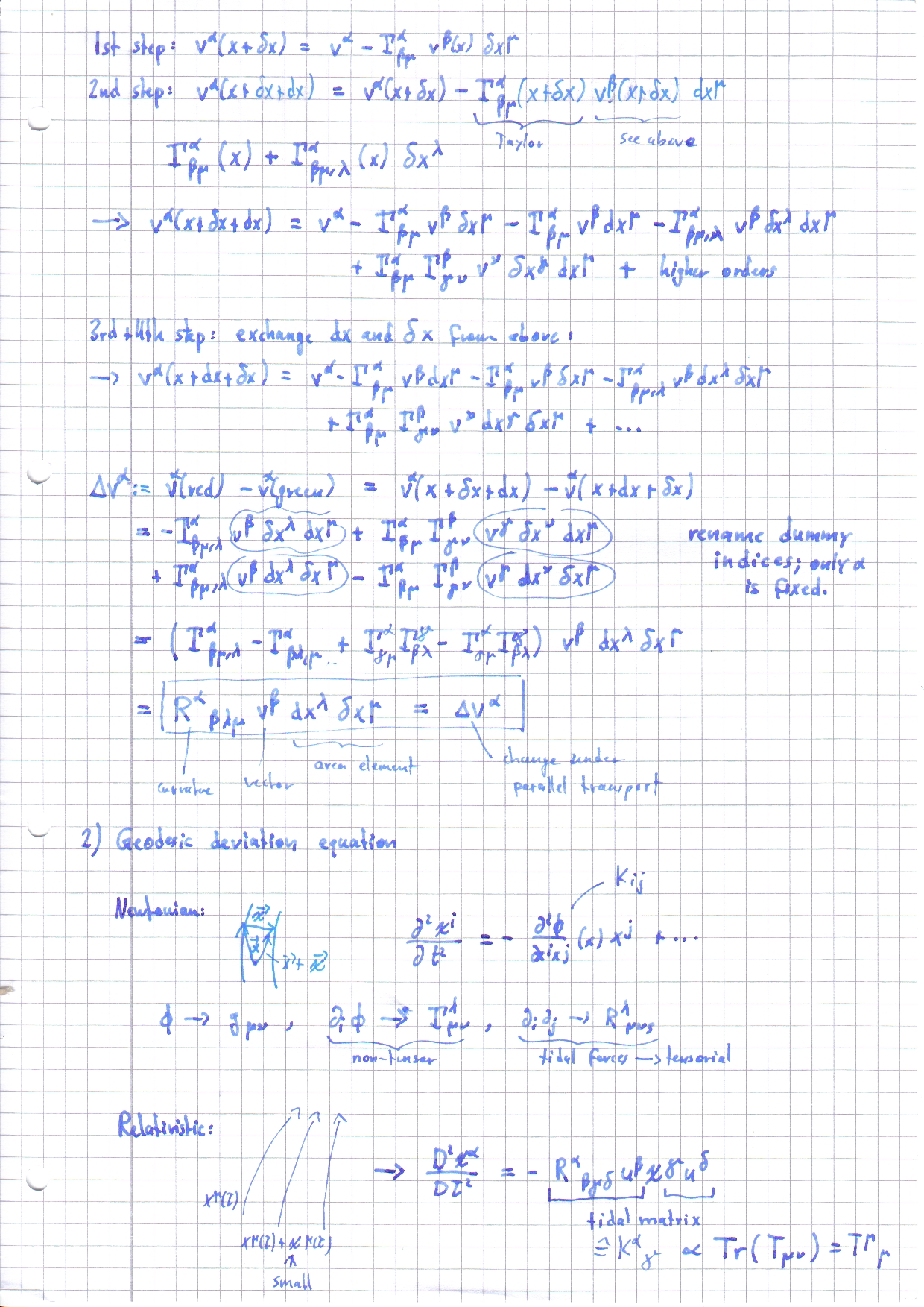 - 2012-11-19: the Riemann curvature tensor (cont'd), further discussion of the Riemann tensor, parallel transport, geodesic deviation equation, the Weyl tensor