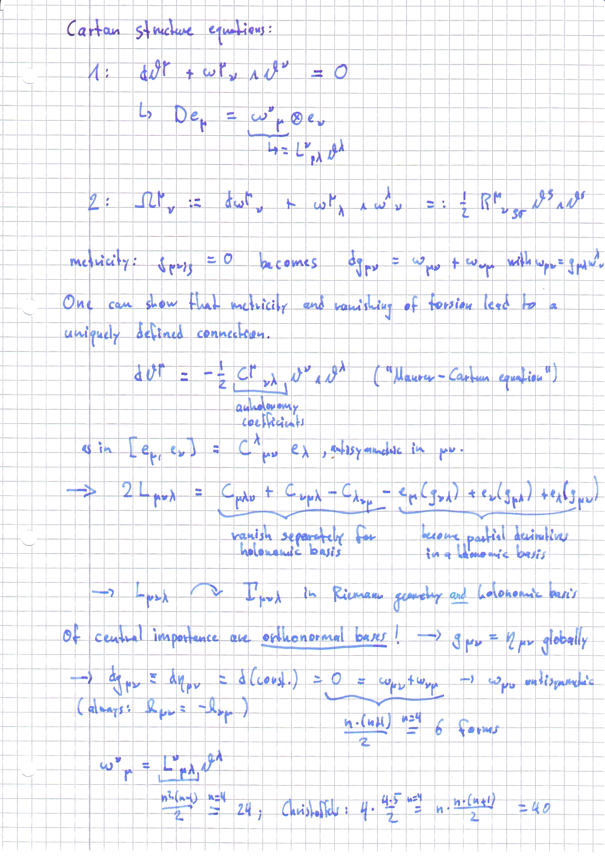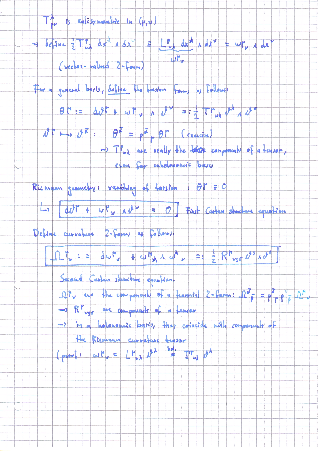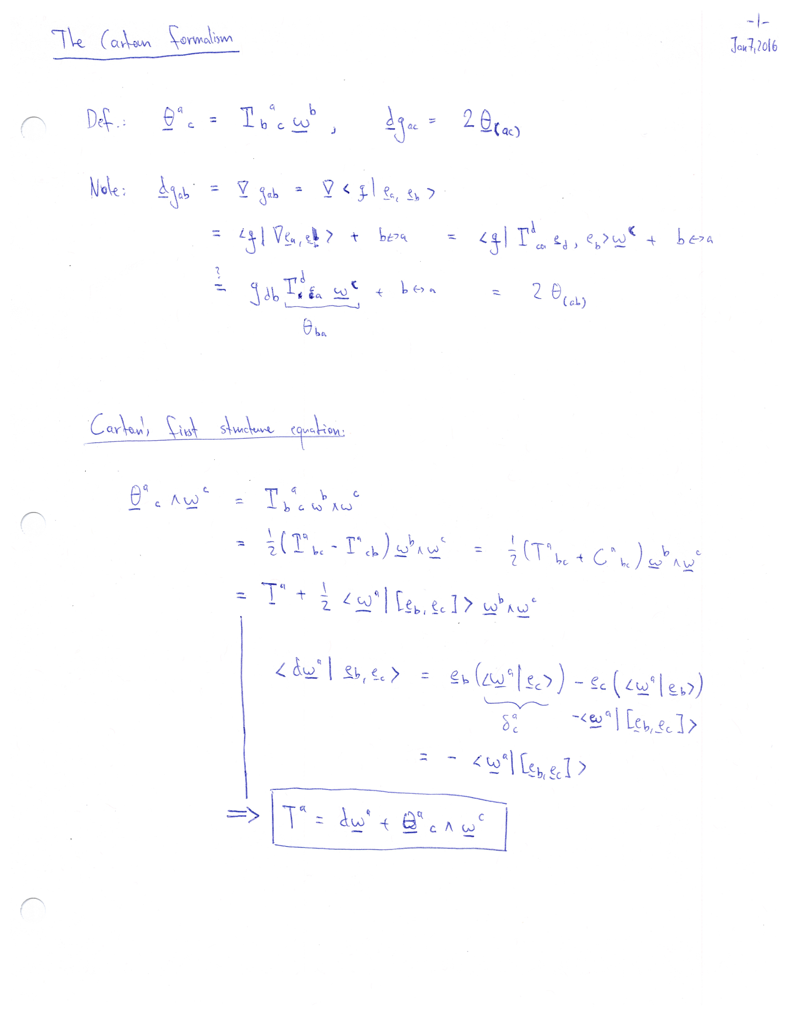 - 2013-01-23: connections and Riemannian geometry, Cartan structure equations, metricity