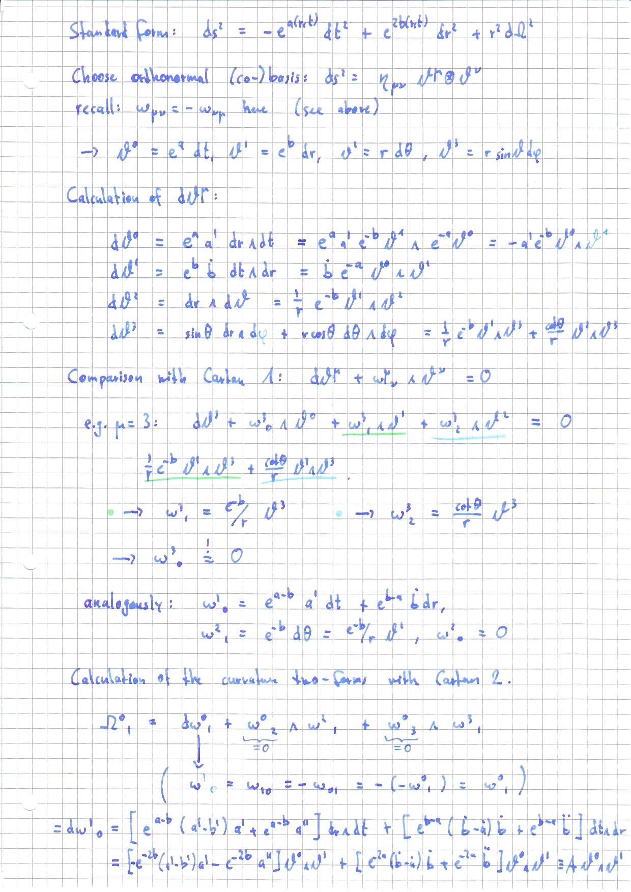 - 2013-01-28: Cartan structure equations (cont'd), Stokes' theorem, the Schwarzschild solution