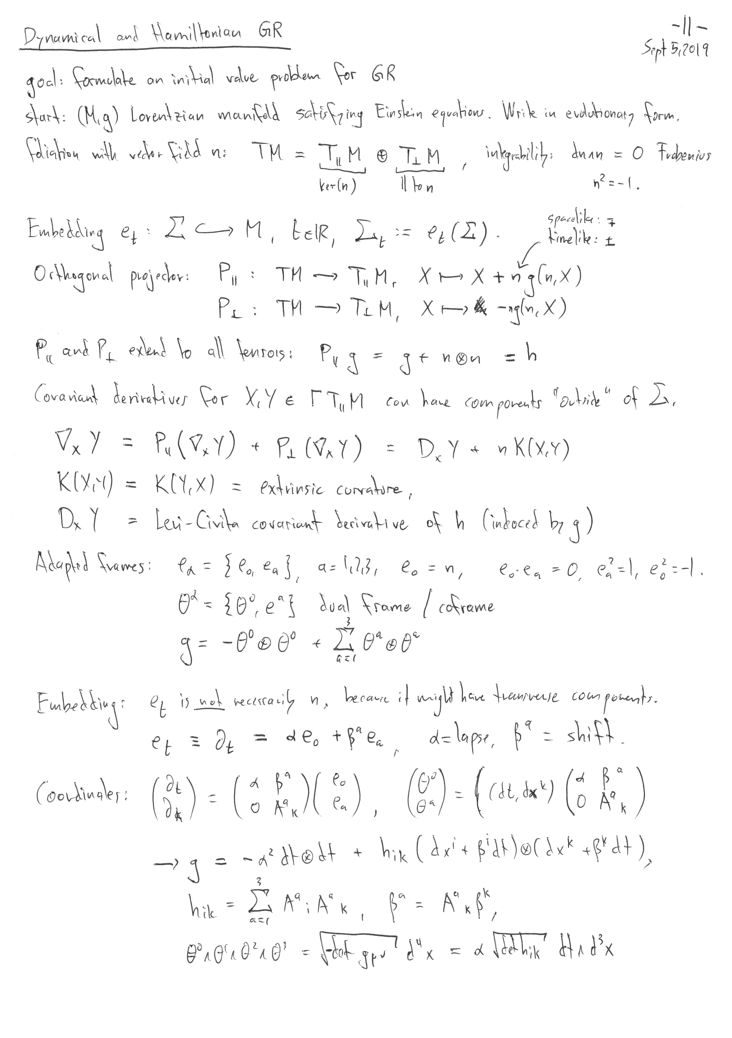 - 2019-09-05: Gauß–Codazzi equations, Hamiltonian constraint, diffeomorphism constraint, evolution equations