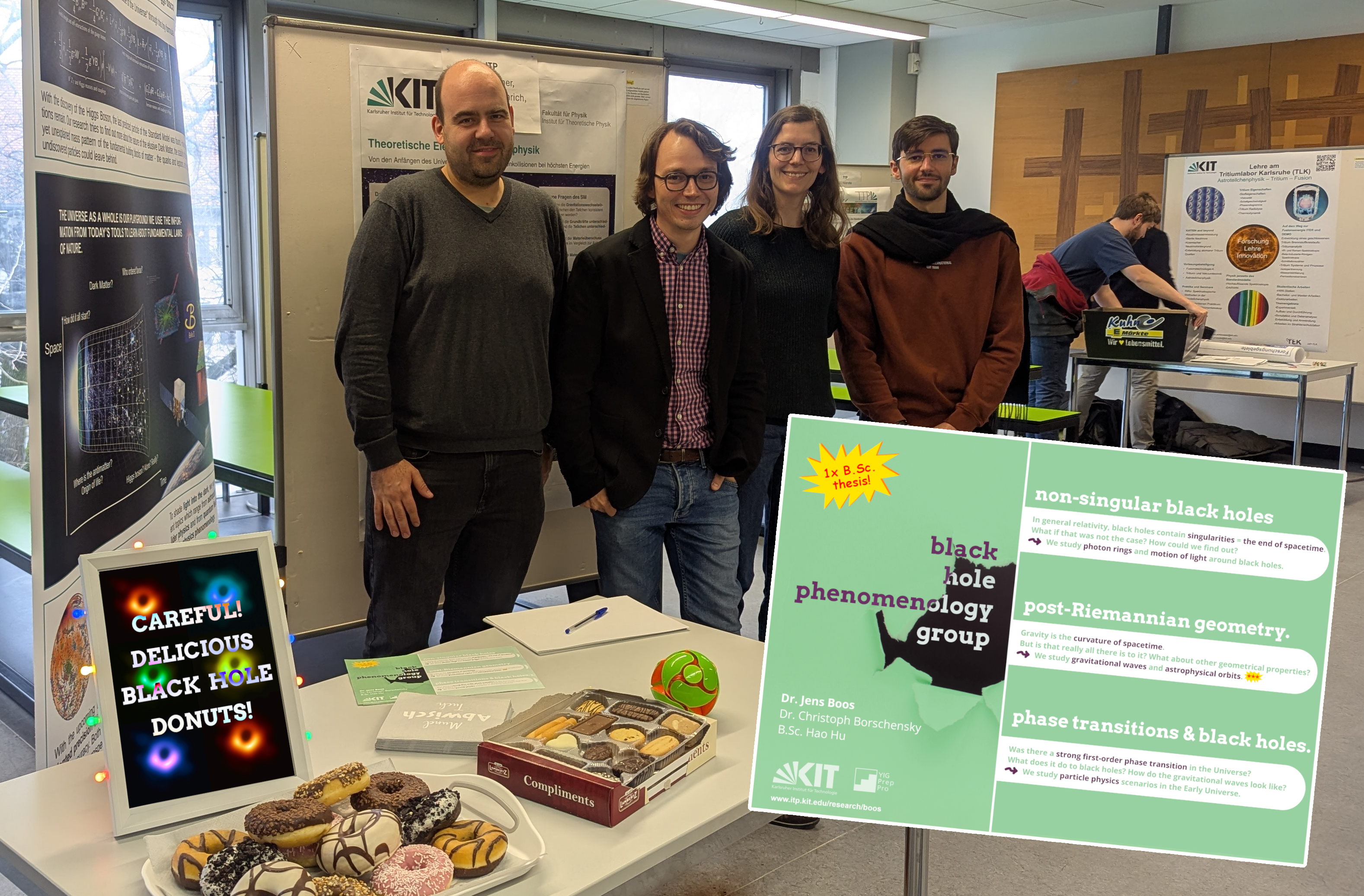 Every year in spring (this photo is from 2025) KIT hosts the “Meet the Institutes” event, where B.Sc. and M.Sc. students can learn about the research activities in the Department of Physics. I am always eager to participate, because it is a great way to meet new students, and tell them about the work that we do. As an extra motivation you can see “black hole donuts” in the picture below: since the black hole photograph of Messier M87 strikingly resembles a donut, I started the tradition to hand out donuts when we present our black hole group.
