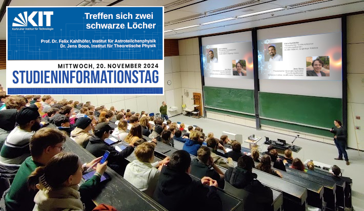 Every fall, KIT invites high school students to come visit us, and we put together a one-day program on all the exciting work we do here. Here you can see my colleague Felix Kahlhöfer and myself give a talk on black holes and gravitational waves. The lecture hall was packed almost to the last seat, it was an incredible experience. We even had to end the question period because the next talk was scheduled to start, but there were just too many questions. Many high school students stayed around, and kept talking with us about their plans and dreams and questions about university life, during a few snacks and coffee.